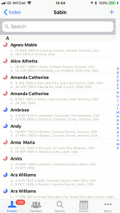 GedView provides a number of indexes to quickly access various items in your tree. These can be quickly "scrubbed" through with the quick access bar on the right, or, with the exception of the timeline searched for specific text.